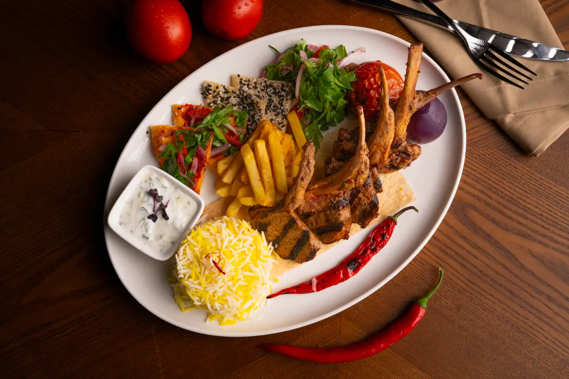 Lamb Chops, Grilled Vegetables, Sesame &halabi Bread With Saffron Rice, French Fries, Saffron Rice