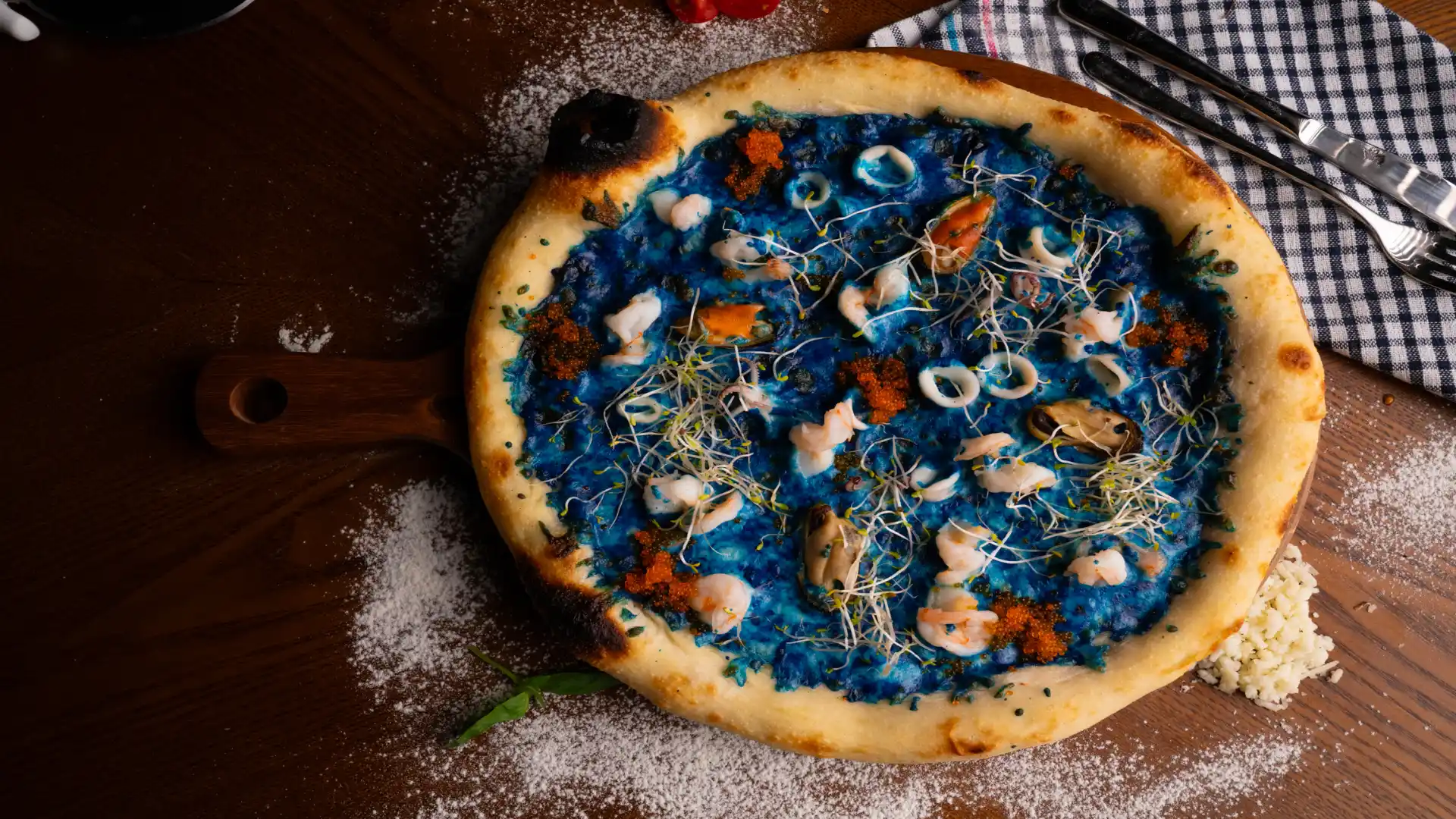 Pizza Dough, Blue River Sauce, Mozzarella, Shrimp, Squid, Crab, Tobiko, Mussels