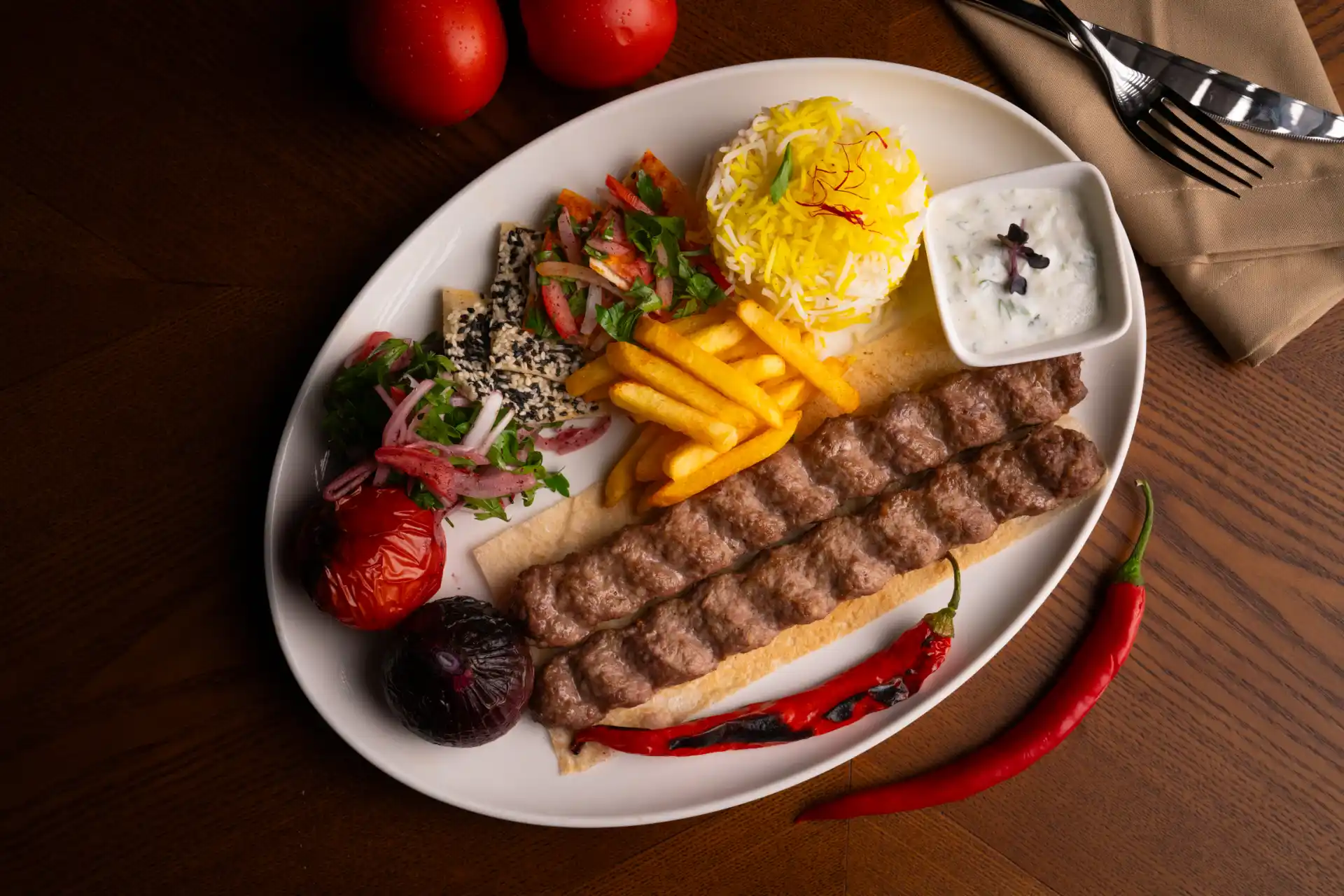 Kabab, Grilled Vegetables, Sesame &halabi Bread With Saffron Rice, French Fries, Saffron Rice