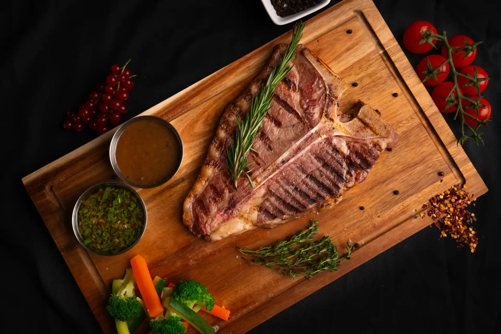 Grilled Usa T-bone Steak Served With Steamed Vegetables, Chimichurri, Black Pepper Sauce